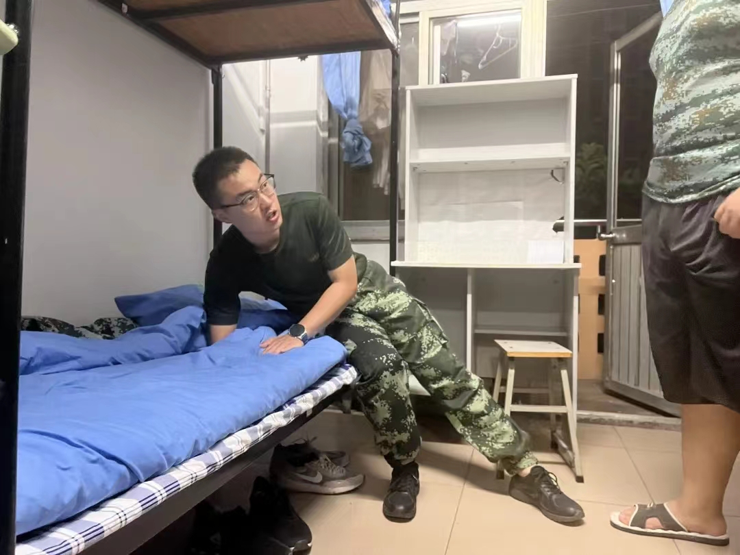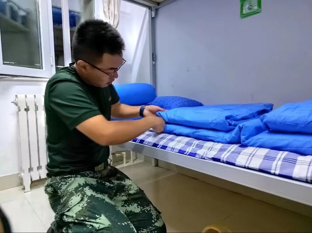 走进宿舍,教官与老师们检查了宿舍的卫生整洁及物品摆放等情况,明确指出存在的问题以及需要改进的地方,向同学们详细讲解了内务整理的标准,着重强调了内务整理中会忽略的细节。随后,教官进行了内务整理的示范,通过边操作边讲解的方式带领同学们学习“豆腐块”叠法。相信在教官耐心、细致的讲解及示范下,同学们将会高标准、严要求完成军训相关任务,也相信2022级新生会将今天学习到的内务整理知识运用到今后的生活中。与此同时,老师与各班班助在走访宿舍的过程中,深入了解新生对新环境的适应情况以及面临的困难和需求等,希望新生尽快转变角色,学会照顾自己、处理好人际关系,做到独立思考、独立生活,并以军训内务整理为契机将良好的生活习惯持之以恒地坚持下去。