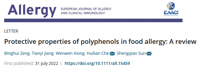 近日,公司哈哈体育孙盛千副教授联合中国农业大学车慧莲教授团队在国际著名顶级期刊《Allergy》(中科院SCI一区TOP,IF=14.71)发表了题为“Protective properties of polyphenols in food allergy: A review”的综述论文。这是公司首次在《Allergy》上发表论文,代表公司在食品与生物工程领域取得的一项高水平研究成果。