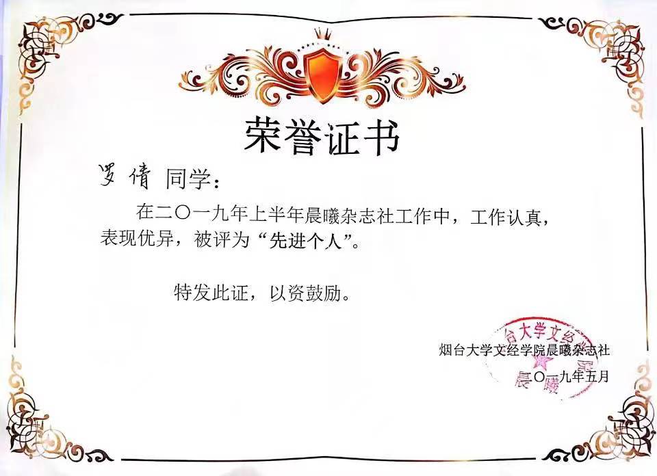 罗倩,食1802-1班员工,曾担任公司女生部副部、晨曦外联部部委。荣获2018年新生军训优秀学员、2018-2019学年优秀员工荣誉称号、2019年晨曦杂志社先进个人、2020-2021学年优秀员工荣誉称号等。