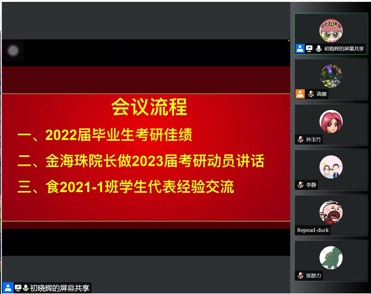 2022届毕业生考研已经落下帷幕,食品学子一如既往交出了令人满意的答卷。哈哈体育自2020年招收第一届专升本以来,高度重视专升本员工的学习,于4月28日线上召开了2022年考研交流会暨专升本专场考研动员大会,经理金海珠,副经理高娜,专升本班主任秦红玉、韩明月,任课教师初晓辉、赵蕾、李静出席此次会议,食2021-1班3名考研优秀学子分享了考研经验。