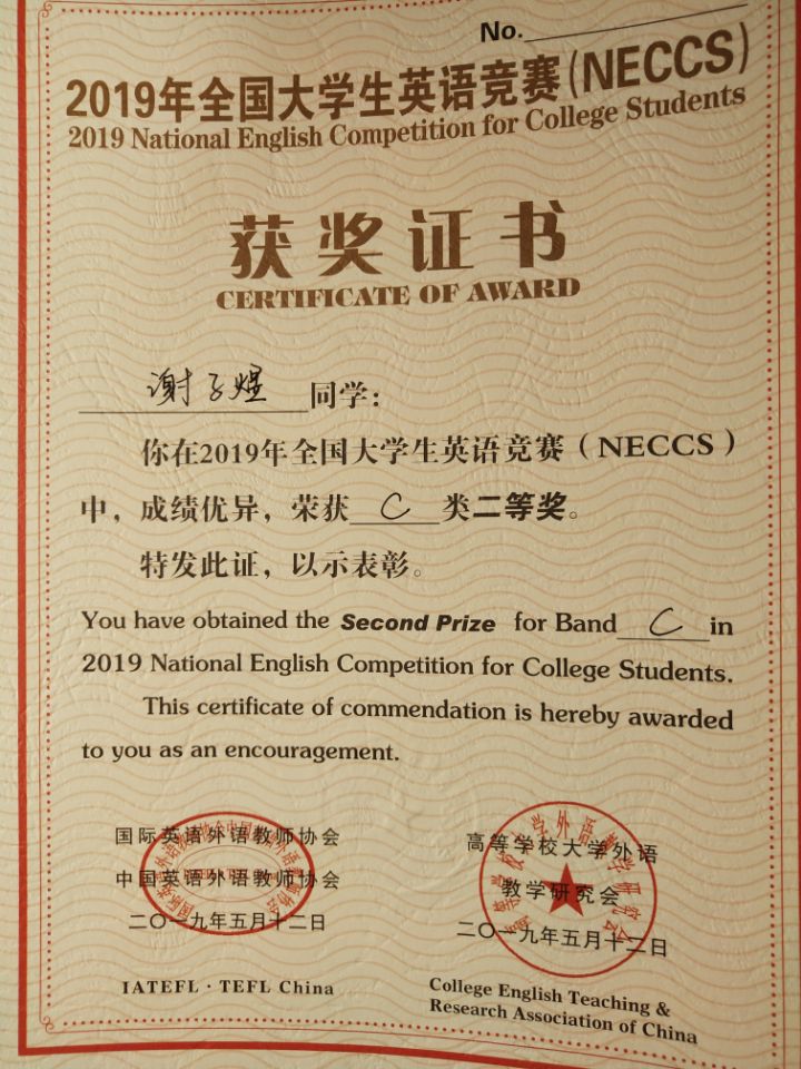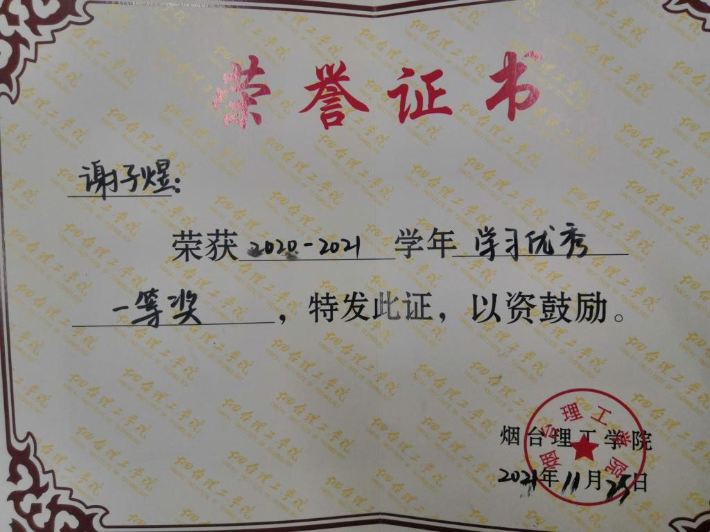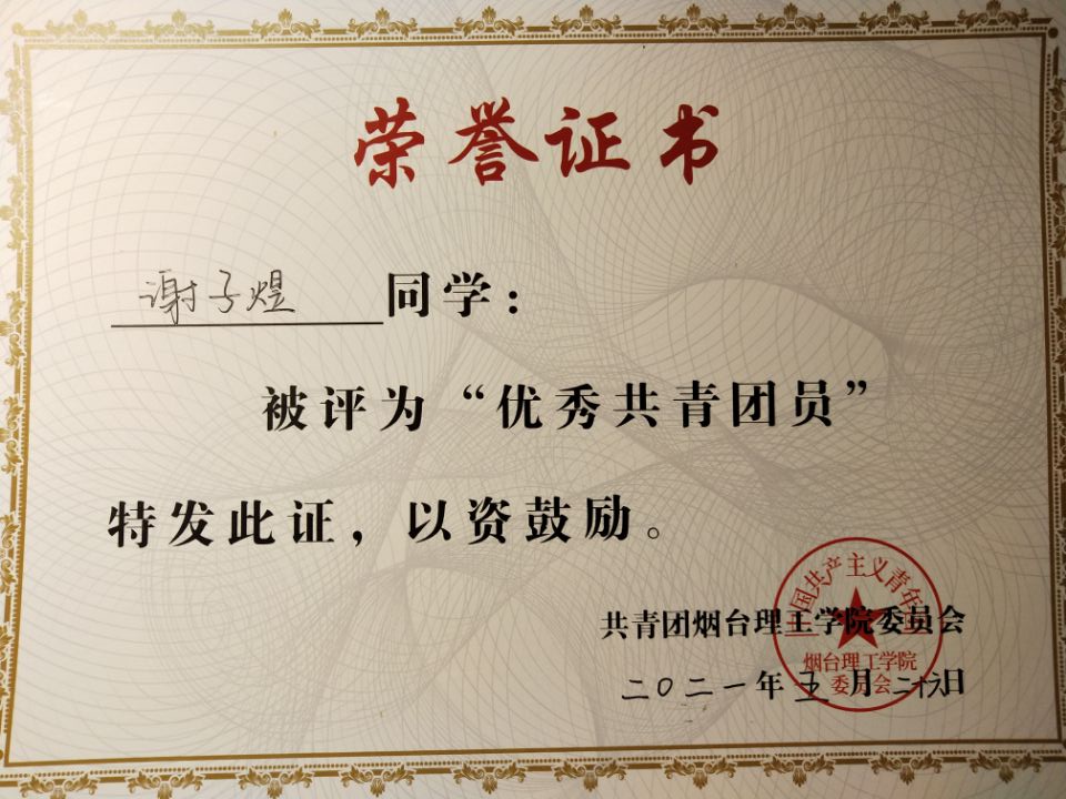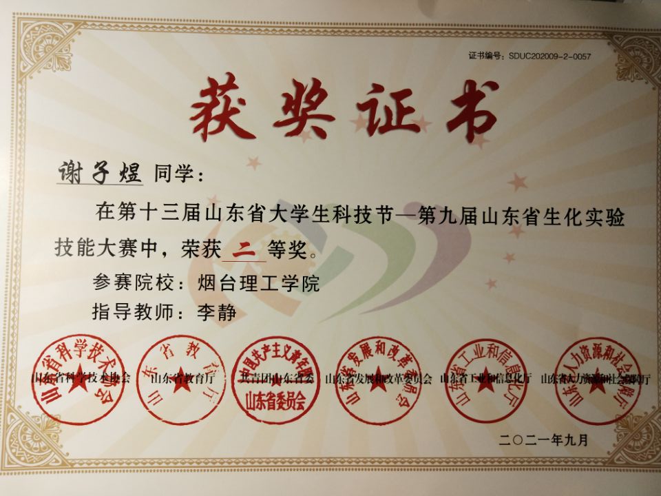 谢子煜曾荣获全国老员工英语竞赛二等奖,山东省生化实验技能大赛二等奖,全国英语写作大赛校赛二等奖,优秀员工标兵奖学金,优秀共青团员,抗疫志愿者等荣誉。