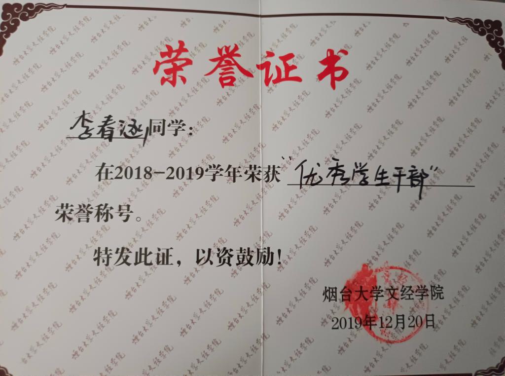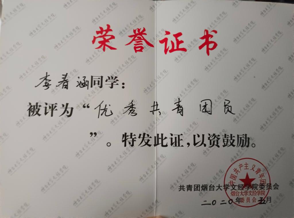 舍长张福荣被海南大学录取,曾获得2019年外研社杯英语写作大赛三等奖,2020年环保公益活动志愿者荣誉证书,2021年烟台市首届老员工创客“蓝色智造”大赛优秀奖等荣誉。李春涵被青岛大学录取,是班级的组织委员,曾获得2018年度优秀共青团员,2019年优秀员工干部,2020年、2021年优秀共青团员,2021年优秀员工荣誉称号以及2022年省级优秀毕业生等一系列荣誉。刘瀛被山东师范大学录取,曾获得2018-2019学年优秀员工荣誉称号。张亦涵被安徽大学录取,曾担任青年志愿者协会副部长。于雪莹被山东农业大学录取,担任团支书,曾担任宣传部副部长,获得过2018年、2019年烟台大学优秀共青团员,2018-2019学年优秀员工,2018年烟台大学文经公司宣传板设计大赛三等奖以及2019年烟台大学文经公司“青春志中国梦”宣传板设计大赛三等奖。