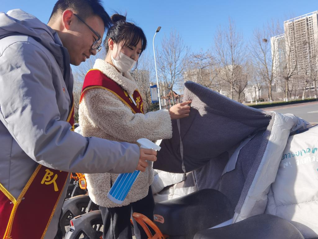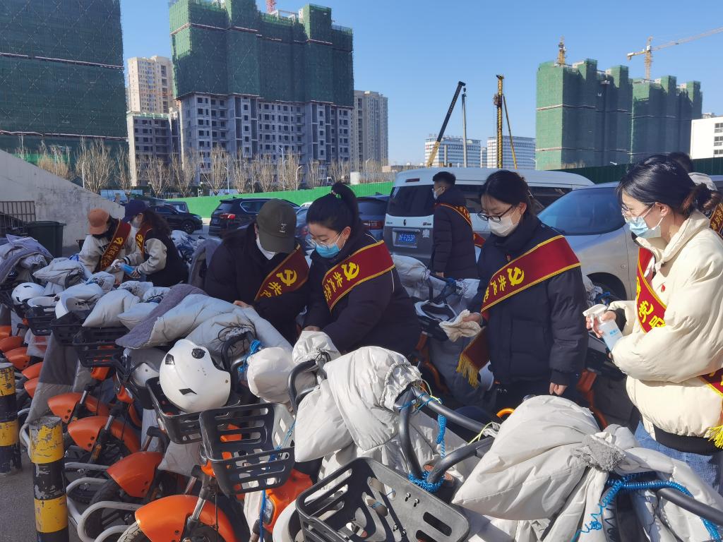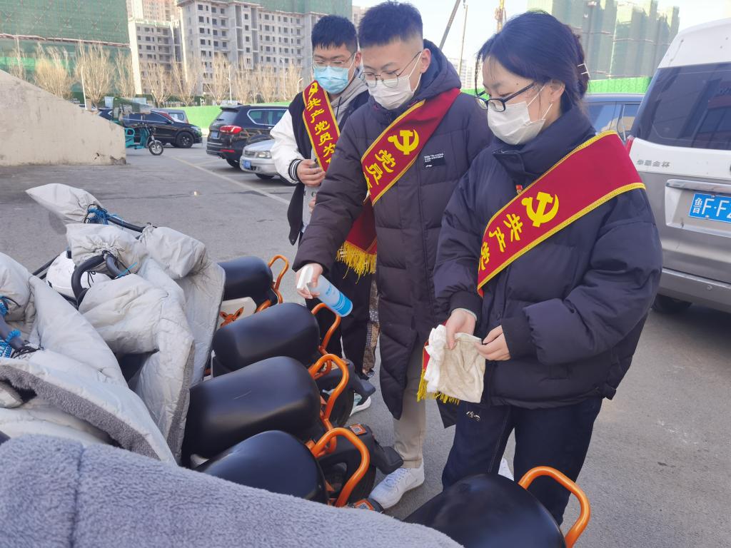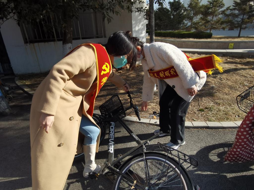 活动开始,员工党员分成两组,分配好任务后,一组去二教门前摆放自行车,一组去七号楼前整理电动车。大家拿着抹布、酒精喷雾等对车辆进行仔细擦拭。虽然天气降温,凉风阵阵,但是丝毫没有影响到同学们的热情,经过大家不懈的努力,二教和七号楼前的电动车停放区焕然一新。最后,全体参与活动的成员在综合楼门前拍照留念。
