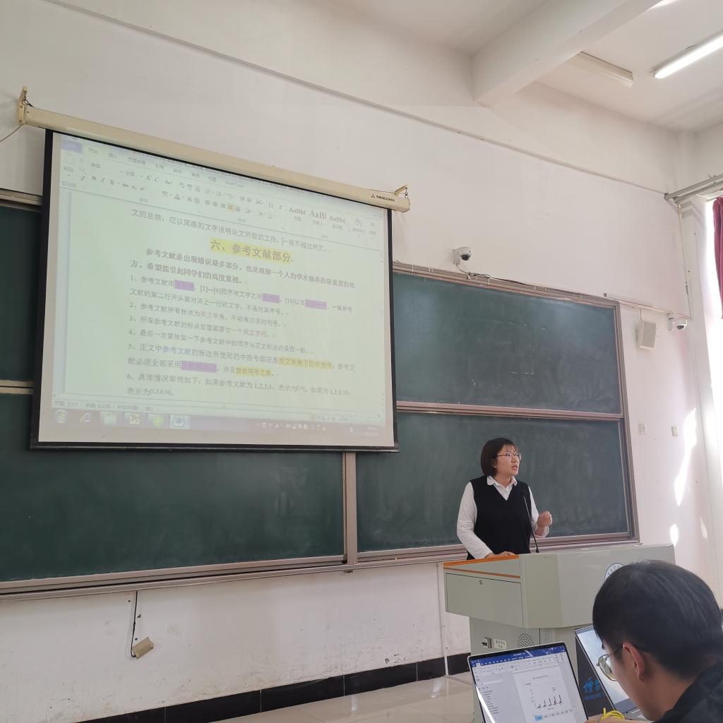 会议伊始,李静老师对毕业论文撰写过程中出现较多的问题进行了梳理,并强调,毕业论文需要满足语句通顺、格式正确以及贴合专业等基本要求。随后,对毕业论文写作的方法、要求和规范,包括正文、致谢、参考文献、附录等部分的格式进行了详细说明。会议最后,初晓辉老师详细讲解了毕业论文答辩的时间节点及具体安排,并指出毕业论文是对学术能力与创新能力的融合和展现,同学们要有自己独特的见解,思想上高度重视,执行上把握时间节点,才能完成层次清晰、逻辑严密的高水平毕业论文。