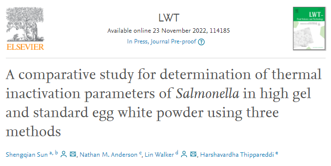 近日,公司哈哈体育留美博士孙盛千副教授联合美国北卡罗来纳州立大学助理教授Dr.Walker在国际顶级期刊 《LWT-Food Science and Technology》(中科院SCI 1区TOP,JCR 1区,IF=6.056)发表了题为“A comparative study for determination of thermal inactivation parameters of Salmonella in high gel and standard egg white powder using three methods”的研究论文。该论文的第一作者单位和通讯作者单位均为HAHA体育,北卡罗来纳州立大学为共同通讯作者单位。