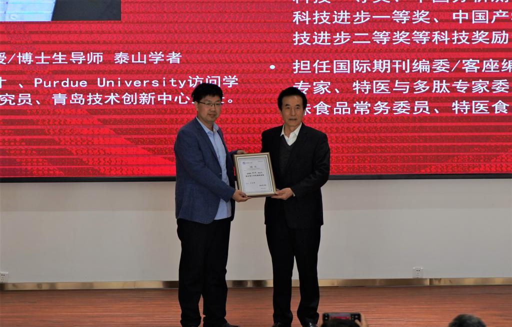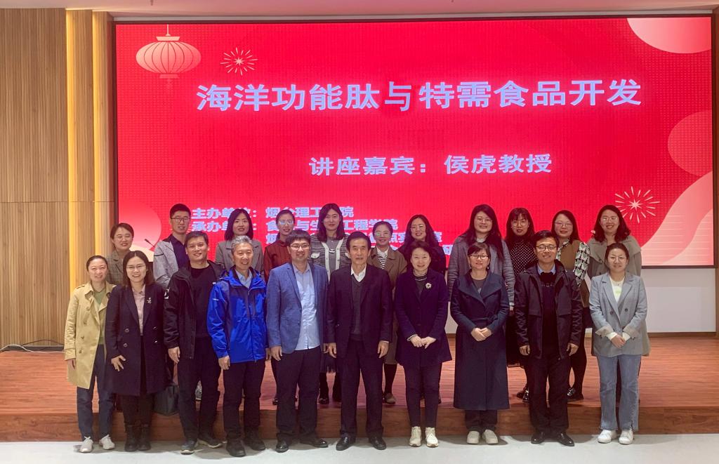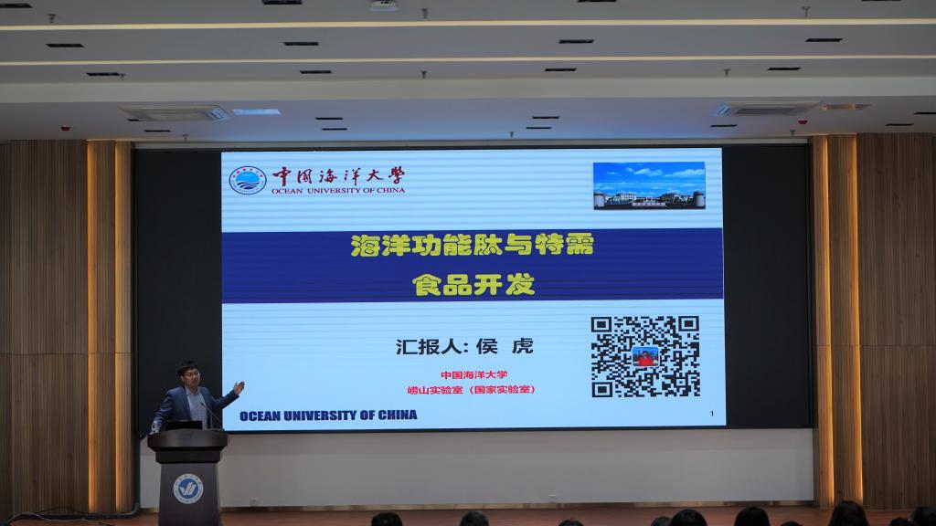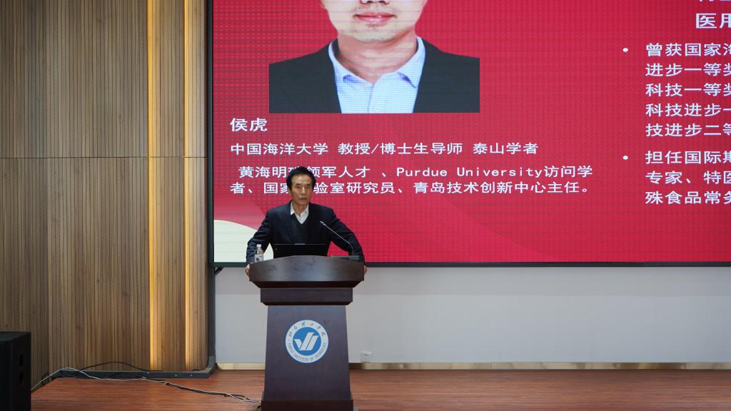 讲座上,侯虎教授介绍了海洋功能肽中标志性成分溯源的科学思路,海洋抗菌肽筛查,海洋功能蛋白与肽的基础研究科研成果及关键制备技术与产品开发。另外,为响应国家海洋战略定位和健康中国的国家大计,侯虎教授还分享了特医配方食品开发的基本策略。从营养食品的配方、工艺、质量标准方面进行了阐述。最后,侯虎教授介绍了他们团队的情况,分享了中国海洋大学西海岸校区建设为学科发展带来的重大契机,对各位专家及有志之士发出了邀请。