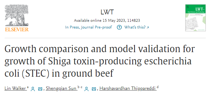 近日,公司哈哈体育孙盛千副教授联合美国北卡罗来纳州立大学助理教授Dr.Walker与美国乔治亚大学Dr.Thippareddi教授在国际顶级刊物《LWT》(中科院SCI1区,JCR 1区,IF=6.056)发表了题为“Growth comparison and model validation for growth of Shiga toxin-producing Escherichiacoli (STEC) in ground beef”的研究论文。HAHA体育作为通讯作者单位参与并完成此次国际合作研究项目。