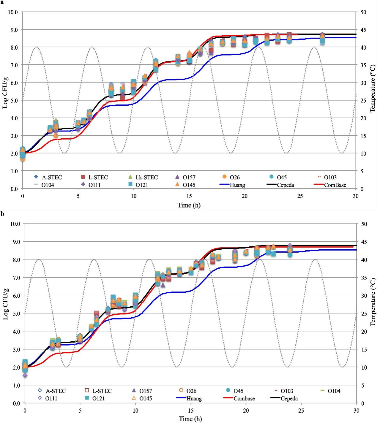 图3:通过Huang等人和Cepeda等人的模型,观察并预测了产志贺毒素大肠杆菌(STEC)在5-15 °C正弦温度下和在高脂肪(27%)(a)和低脂肪(7%)(b)绞碎牛肉中的生长。