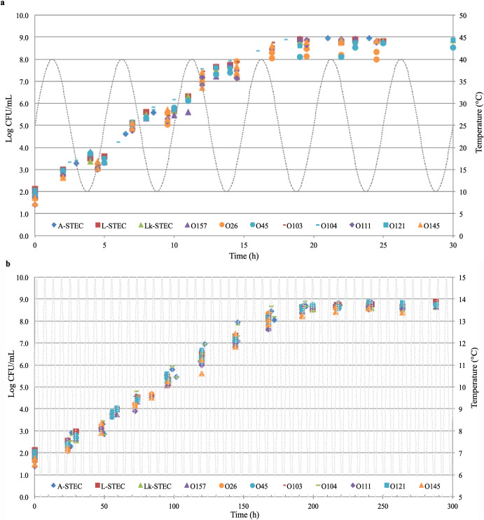 图2:在高温(10–40°C) (a) 和低温 (5–15°C) (b) 正弦曲线温度下观察到产志贺毒素大肠杆菌 (STEC) 在改良胰酶大豆肉汤(TSB) 中的生长。