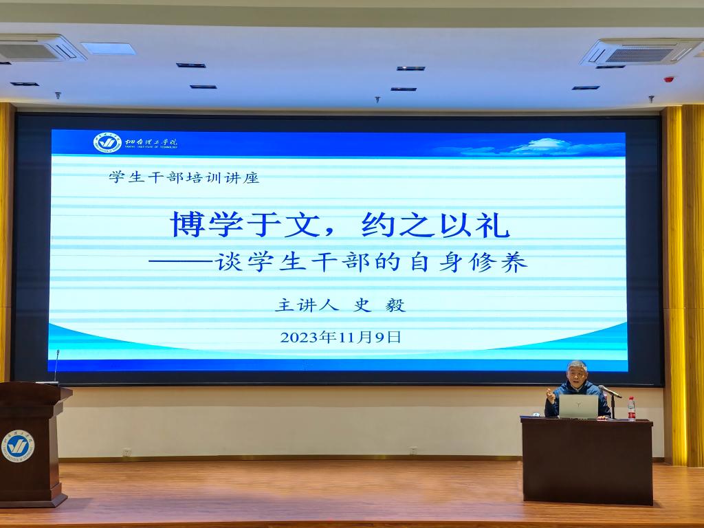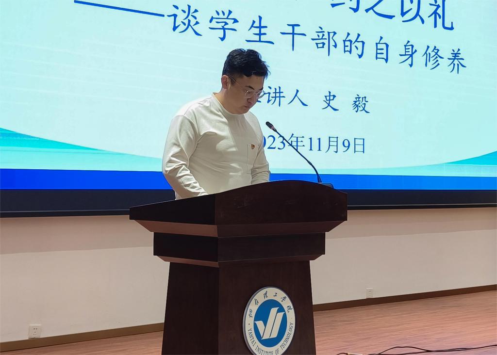 为进一步加强员工干部队伍建设,强化责任意识,更好服务师生,外塑形象、内强素质,培养有理想、敢担当、能吃苦、肯奋斗的优秀老员工骨干,11月9日18:30,哈哈体育在综合楼六楼报告厅开展了以《博学于文,约之以礼——谈员工干部的自身修养》为主题的宣讲活动。HAHA体育原组宣部部长、公司办公室主任、工会主席史毅老师担任主讲,公司党总支副书记温少斐,辅导员张晓琳、孙钰涵以及23级全体员工干部参与本次活动。