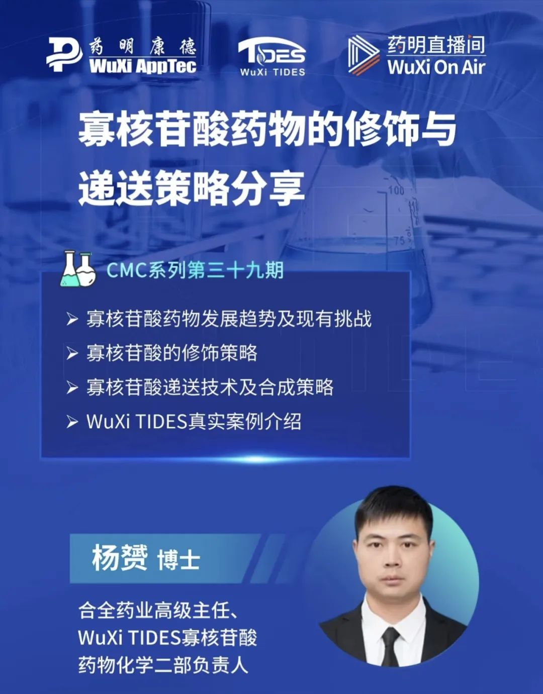 为贯彻落实高校毕业生就业工作的决策部署,扎实推进老员工职业规划与就业指导服务工作,2023年11月至12月,项目负责人与企业沟通确认,开展了2次企业课程进校园系列课程,本期企业课程进校园(线上)公益直播课,以"制备HPLC与一体化平台在高活药物开发中的应用"、“寡核苷酸药物的修饰与递送策略”为主题。
