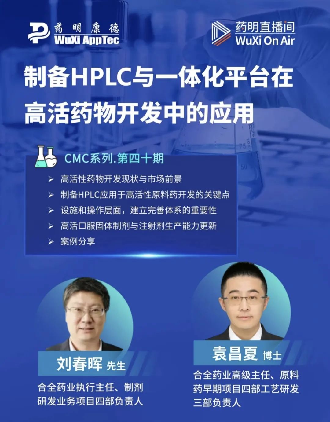 合全药业高级主任、原料药早期项目四部工艺研发三部负责人袁昌夏博士围绕制备HPLC大量分离高活化合物的工艺流程进行讨论。随着高活化合物市场规模和应用领域的扩大,企业面临的挑战是在保护人员安全的基础上,如何制备大量高活化合物。袁博士分享了工艺流程上的三步处理法、制备方法的开发策略、分离设备的清洗思路、工厂设计的三级控制等,生产过程中以控制泄露和残留作为高活原料药开发关键点的选择依据。合全药业执行主任、制剂后期项目四部负责人刘春晖先生阐述了制备高效液相色谱技术应用于高活原料药的开发与生产应用的必要性,提出过程中需要考虑安全性、精确性与可靠性。袁博士和刘主任先后就高活性药物开发现状与市场前景、制备HPLC应用于高活性原料药开发的关键点、设施和操作层面建立完善体系的重要性、高活口服固体制剂与注射剂生产能力更新等方面进行了详细阐述。