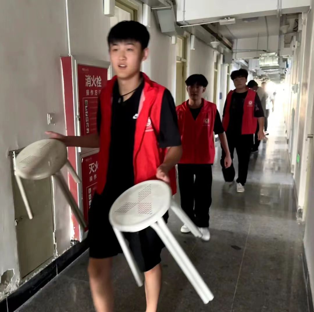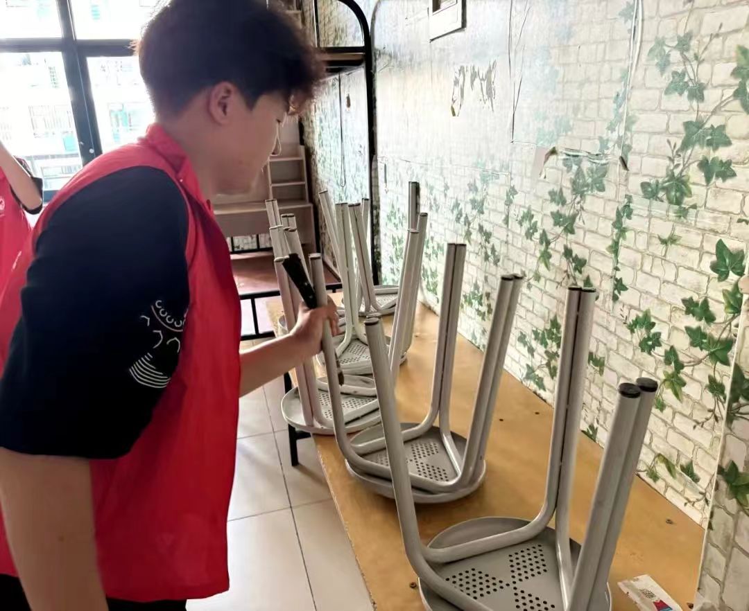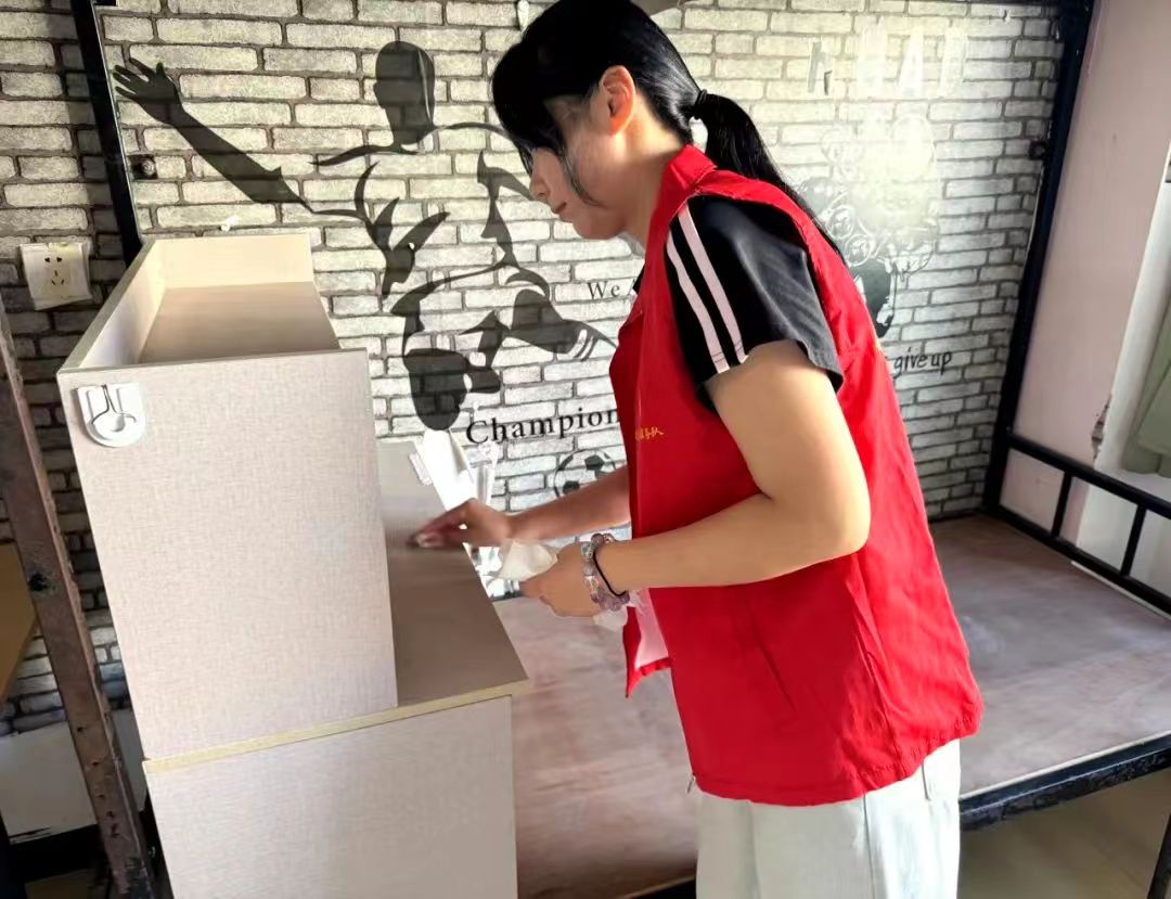 老师和同学们怀揣着满满的热情与爱心,他们分工明确,有条不紊地进行着清扫工作。有的拿起扫帚,仔细清扫地面的灰尘与杂物;有的拿着抹布,认真擦拭桌椅、窗台,不放过任何一个角落尽显精益求精之态,宿舍面貌焕然一新。在清扫过程中,志愿者们充分发扬了不怕脏、不怕累的精神,以实际行动践行着“为同学服务”的核心思想。他们的身影穿梭在各个宿舍之间,忙碌而坚定,仿佛是一群传递温暖与希望的使者。