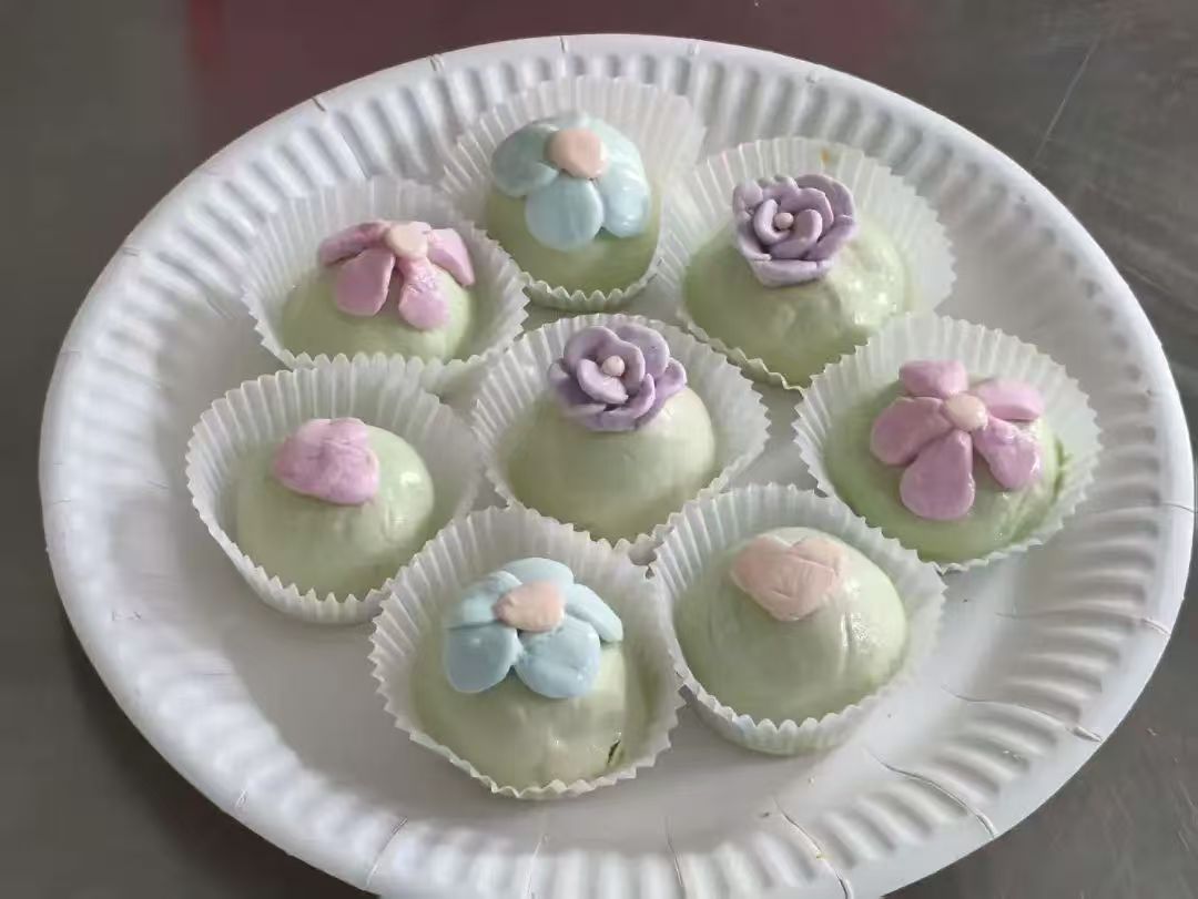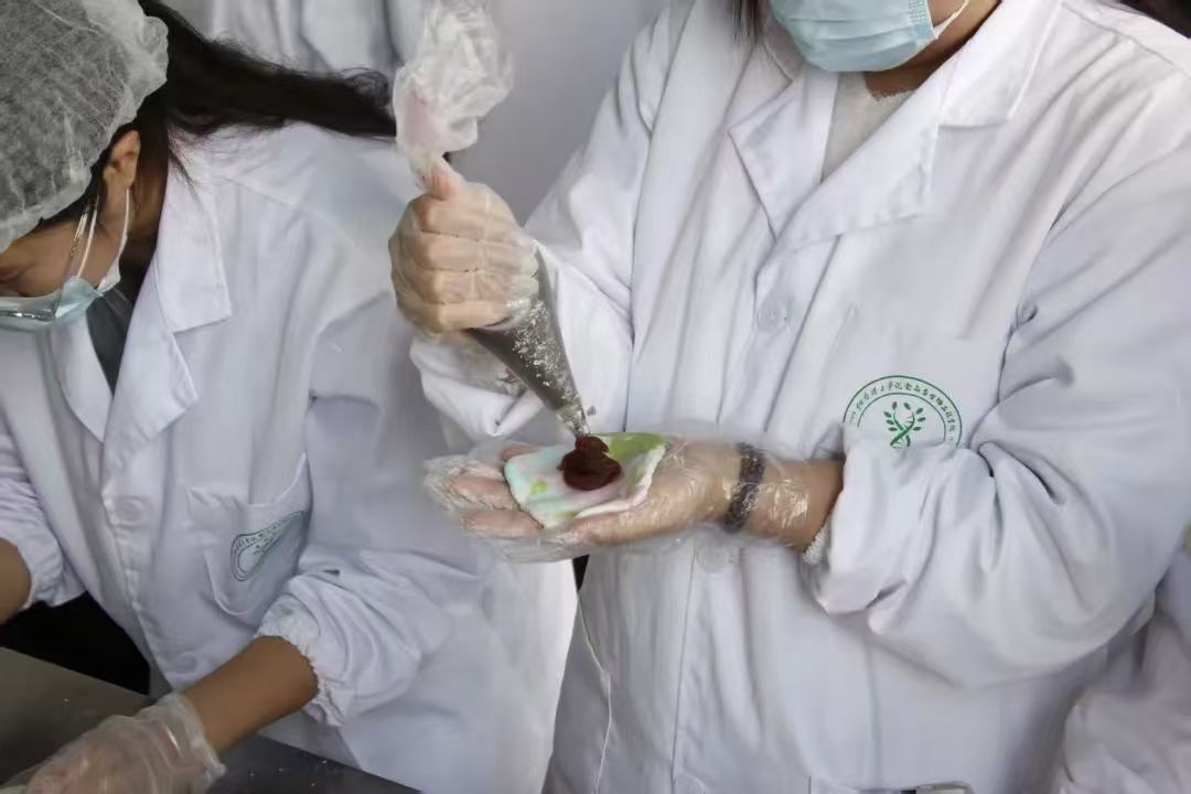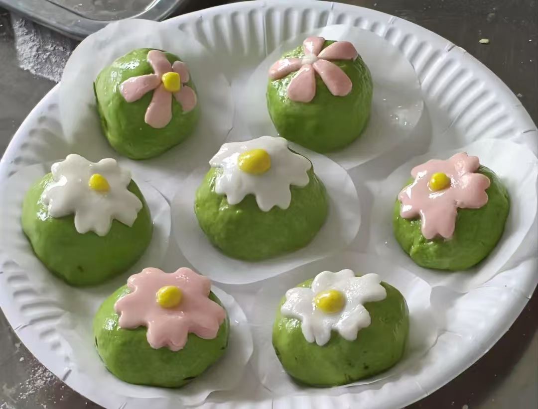 比赛现场气氛热烈,同学们热情高涨。每组参赛选手分工明确,紧密配合。他们精心调配,创意造型,将一个个造型独特、色彩诱人的青团呈现在大家眼前。有的青团被塑造成花朵形状,象征着春天的生机;有的则被捏成熊猫模样,憨态可掬,栩栩如生。同学们在制作青团的过程中,互相交流经验,分享想法,充分展现了食品学子的实践能力和创新意识。