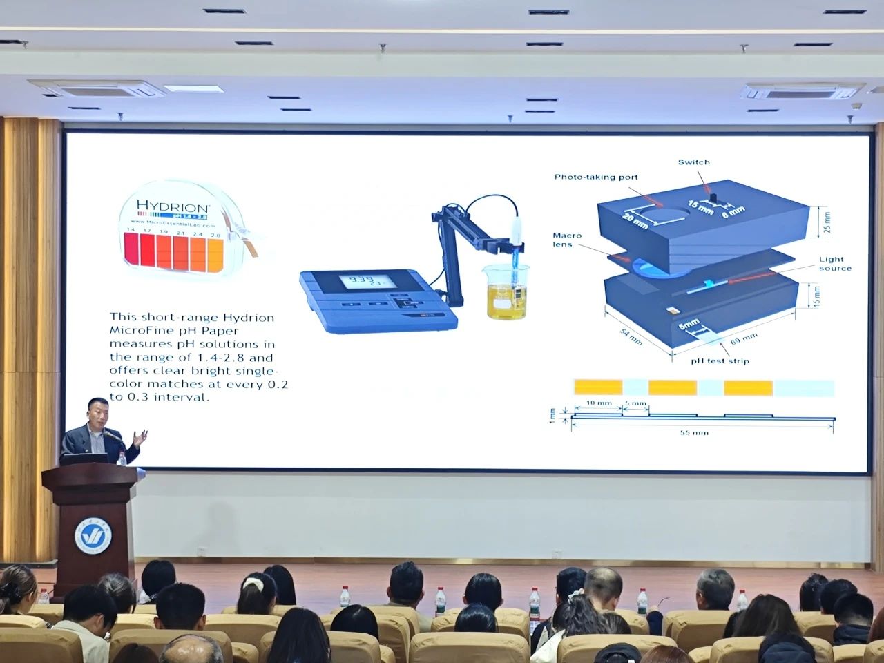 报告中,于教授系统讲解了从“电化学——生物传感——癌症标定物——化学材料模拟疏水结构——光盘光驱”等一系列研究创新路径,展示了通过仿生设计与功能材料相结合,构建便携、精准、高灵敏的癌症早筛检测平台。他特别介绍了光盘光驱在生物分析中的创新性应用,提出低成本、高效率的检测方式在公共健康领域的广阔前景。同时,于教授聚焦于“手机传感”的最新研究进展,展示了如何利用智能手机进行食品中黄曲霉素的拍照检测,实现半定量分析;并通过图像采集和波长识别技术,实现对样品pH值的判断。这一“手机+化学”模式,为未来智能检测技术与食品安全监管的深度融合提供了可行路径,也为公司的团队建设指出新方向和新路径。