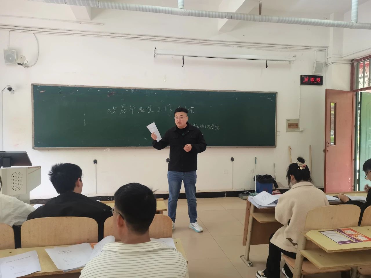 会议伊始,孙钰涵老师针对毕业生相关材料的填写进行了细致讲解。他尤其强调,考核表记录是毕业生在校综合表现的重要凭证,关乎同学们毕业资格审核与档案完整性。随后,孙钰涵老师重点分析了当前就业形势,他介绍了公司提供的就业资源,鼓励大家积极引导班级同学树立正确就业观,主动拓宽就业渠道,对于就业困难同学及时反馈,公司将给予针对性指导。同时,孙钰涵老师希望班长、团支书发挥带头作用,协助有困难的同学解决问题,主动关心班级同学,营造互帮互助的良好氛围。