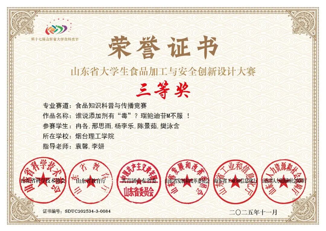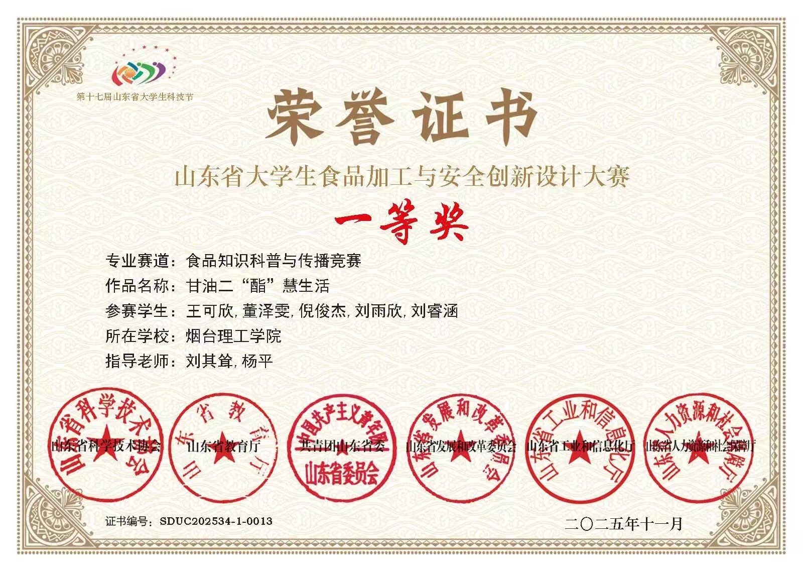 本次食品加工与安全创新设计大赛特设食品知识科普竞赛单元,以线上视频竞技的形式,创新科普传播路径,拓宽员工表达舞台。参赛团队聚焦食品加工原理、安全防控要点与营养健康常识等主题,通过趣味实验、动画解析、情景演绎等多种形式,将专业知识转化为通俗易懂的科普内容,充分展现了扎实的学科功底与出色的创意表达能力。在由专任教师刘其耸、杨平联合指导的参赛作品中,团队从选题策划、内容构建到视频呈现均经过多轮打磨,最终作品因兼具专业深度与传播趣味,荣获大赛一等奖。