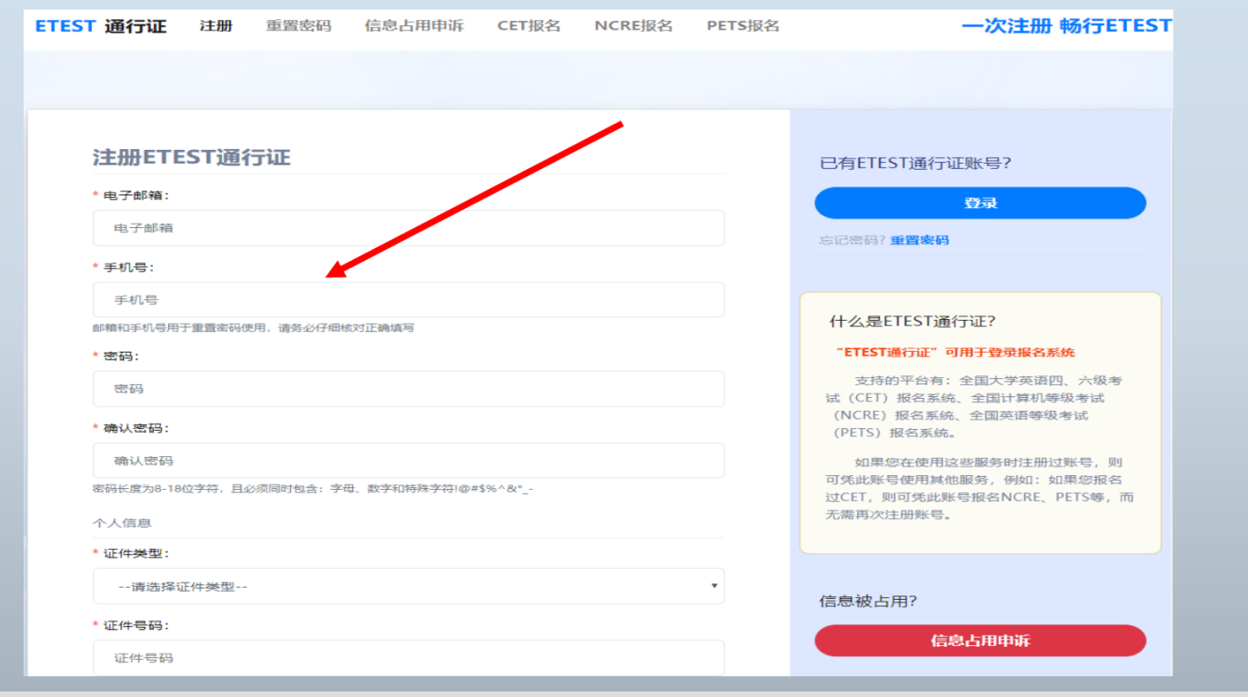 一、本次报名将首次启用“手机验证码登录报名平台”与“身份证实名验证”双重安全检测功能,如果考生未使用本人手机注册或身份证被他人占用,将无法进行报名并需进行“人工验证”,时间可能较长。为确保考生顺利、快速报名,现请各公司告知员工(特别是首次报考),在报名前完成报名网站(https://passport.neea.edu.cn)用户注册及手机验证,以免耽误报名。如考生发现个人信息(身份证号、手机号登)被占用的情况,请尽早完成手持证件照上传核验工作。