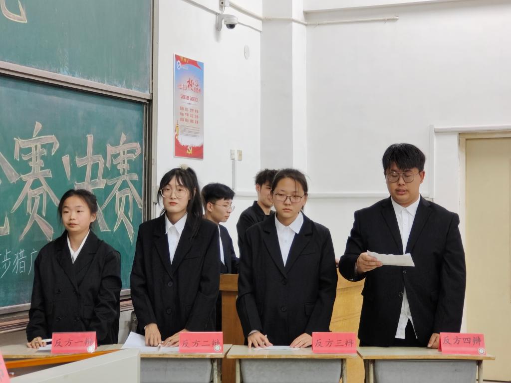 本次辩论决赛采取四对四团体辩论制,总共设有四个环节,分别为开篇立论、对辩盘问、自由辩论和总结陈词。经过初赛的角逐,食2203-1班代表队和食2204-1班代表队进入总决赛。正方辩题为“博览群书,涉猎广博”,反方辩题为“读书贵专,求精求深”。铃声响起,双方辩手立刻进入状态,首先由正方一辩开篇立论,提出论点,剑锋直指主题。对方四辩也不甘示弱,抓住漏洞,强势回击。双方引经据典,据理力争。紧接着,迎来双方交锋。你来我往的质询将辩论赛推上高潮,双方辩手唇枪舌剑,妙语连珠,场下观众反应热烈,掌声不断。自由辩论环节,双方辩手逻辑清晰,表述犀利,充分展现了双方辩手的智慧与才思。总结陈词阶段,双方四辩更是坚守阵地,金句频发,展现了深厚的理论功底。