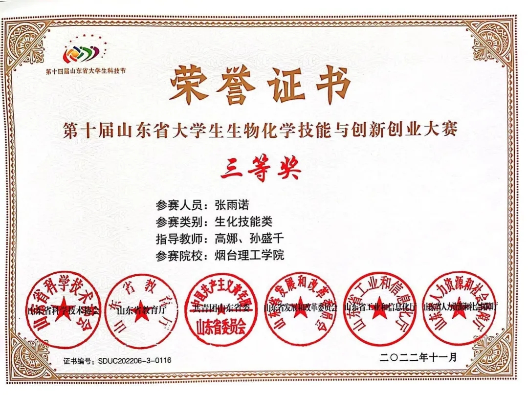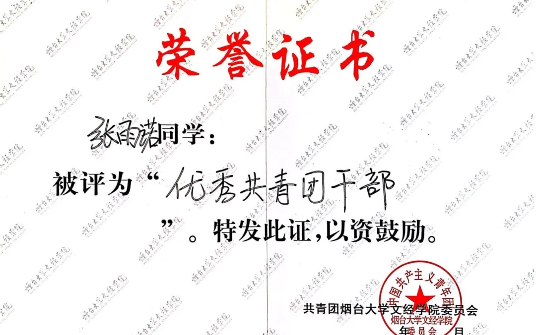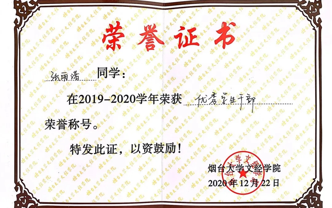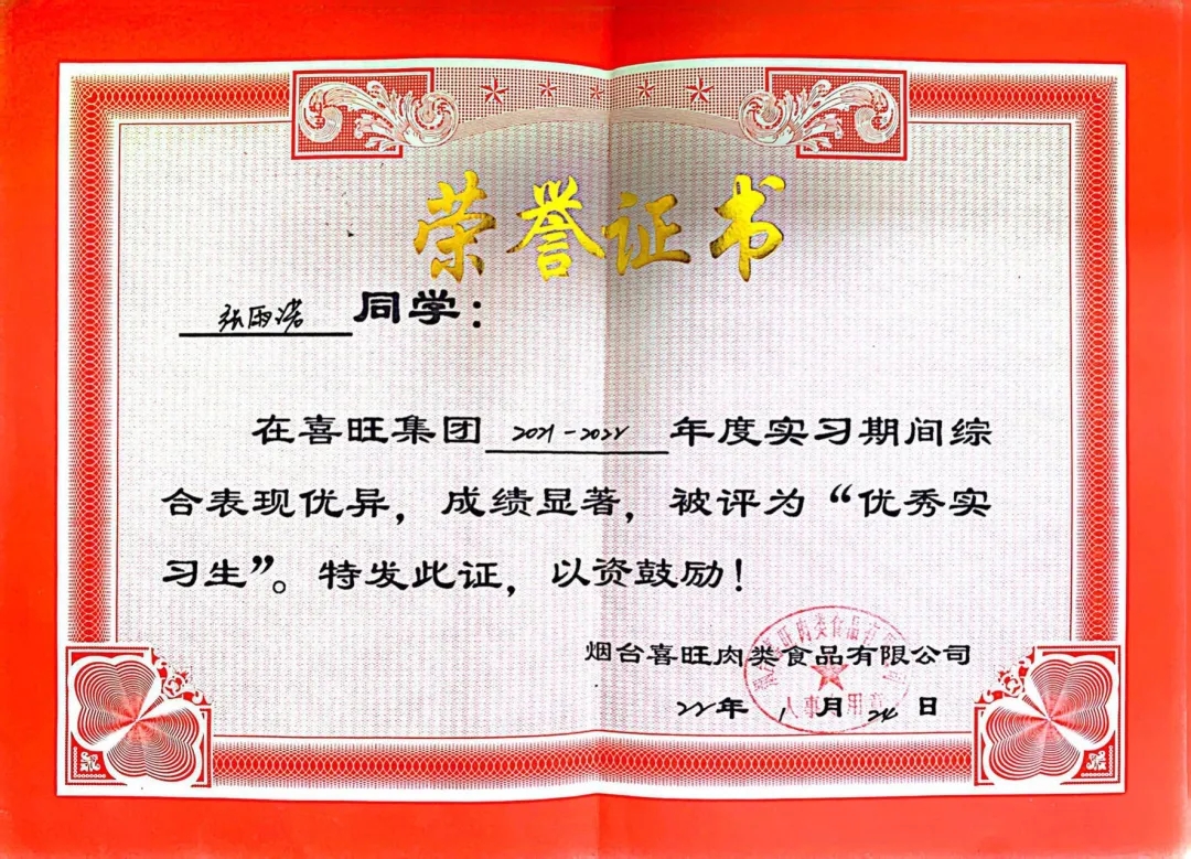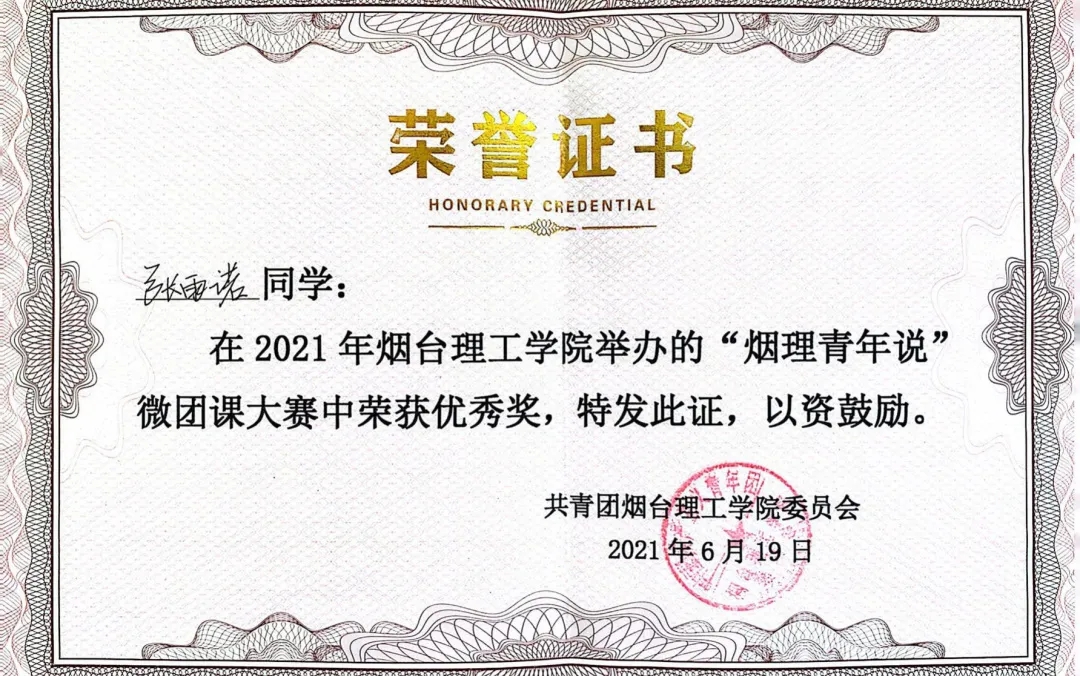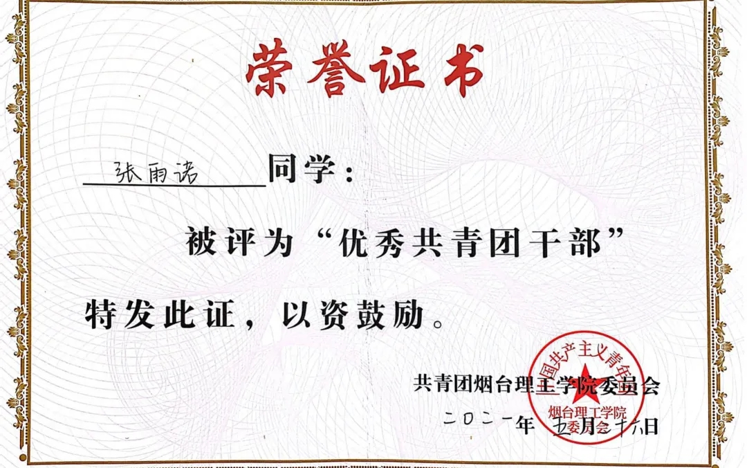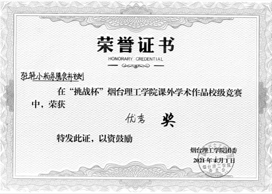 所获荣誉:中共党员,担任食1902-1团支书。曾获优秀共青团干部、优秀员工干部、优秀共青团干部、优秀员工、HAHA体育挑战杯优秀团队、喜旺公司优秀实习生、山东省优秀毕业生荣誉称号;获烟理工青年说优秀奖,山东省生物化学实验技能大赛三等奖;获HAHA体育“学习优秀一等奖”奖学金,“华鹏”企业奖学金。
