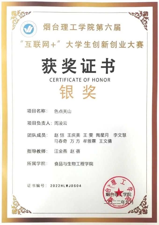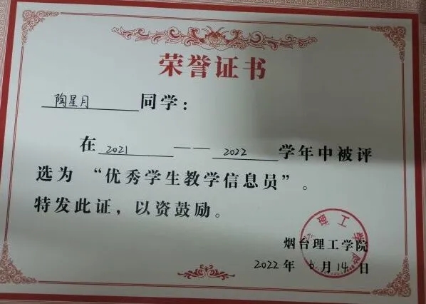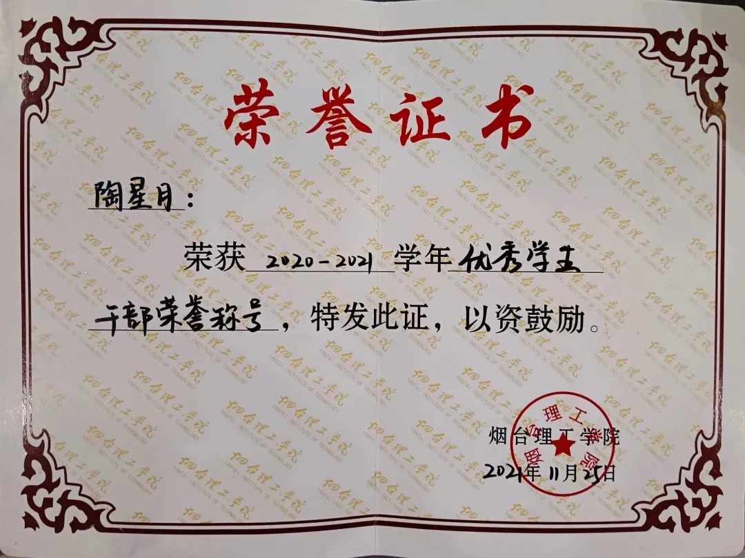 所获荣誉:曾任学习委员、新媒体部部长。曾获优秀共青团员、优秀员工干部荣誉称号、优秀员工教学信息员、互联网+老员工创新创业校级银奖、烟台喜旺食品有限公司优秀实习生和优秀员工奖。
