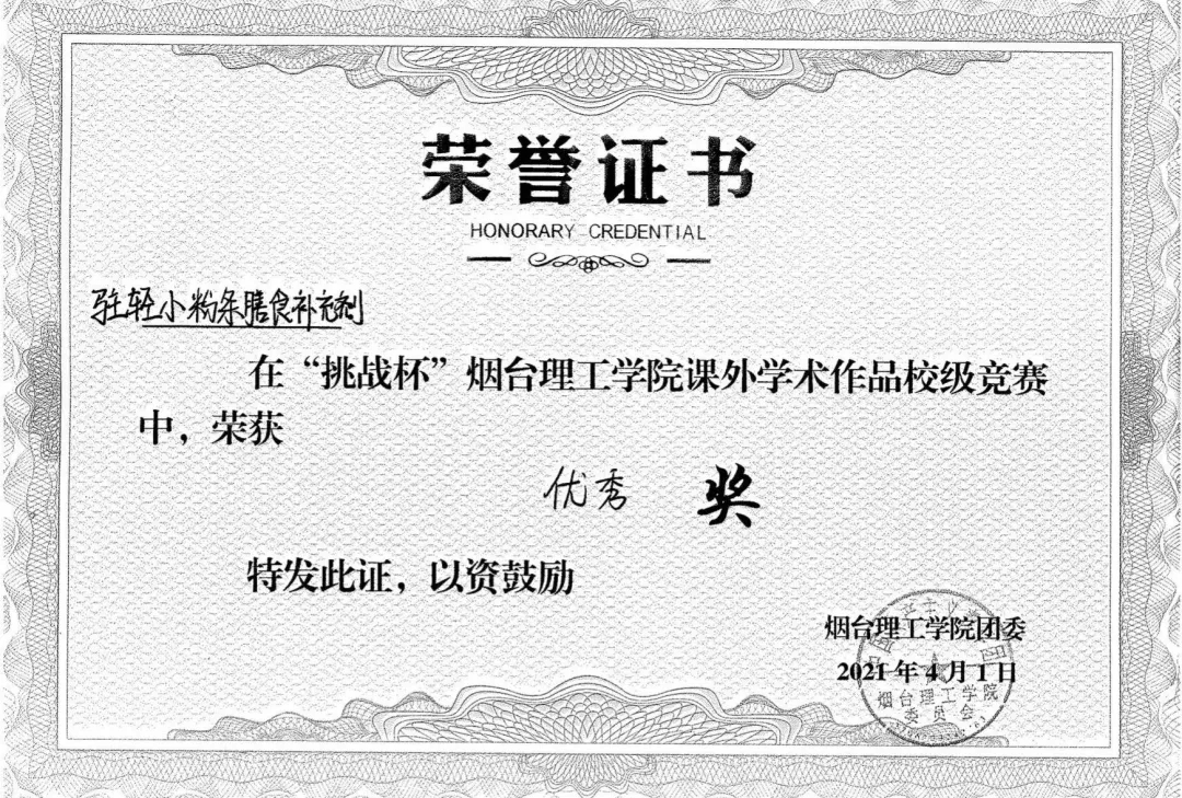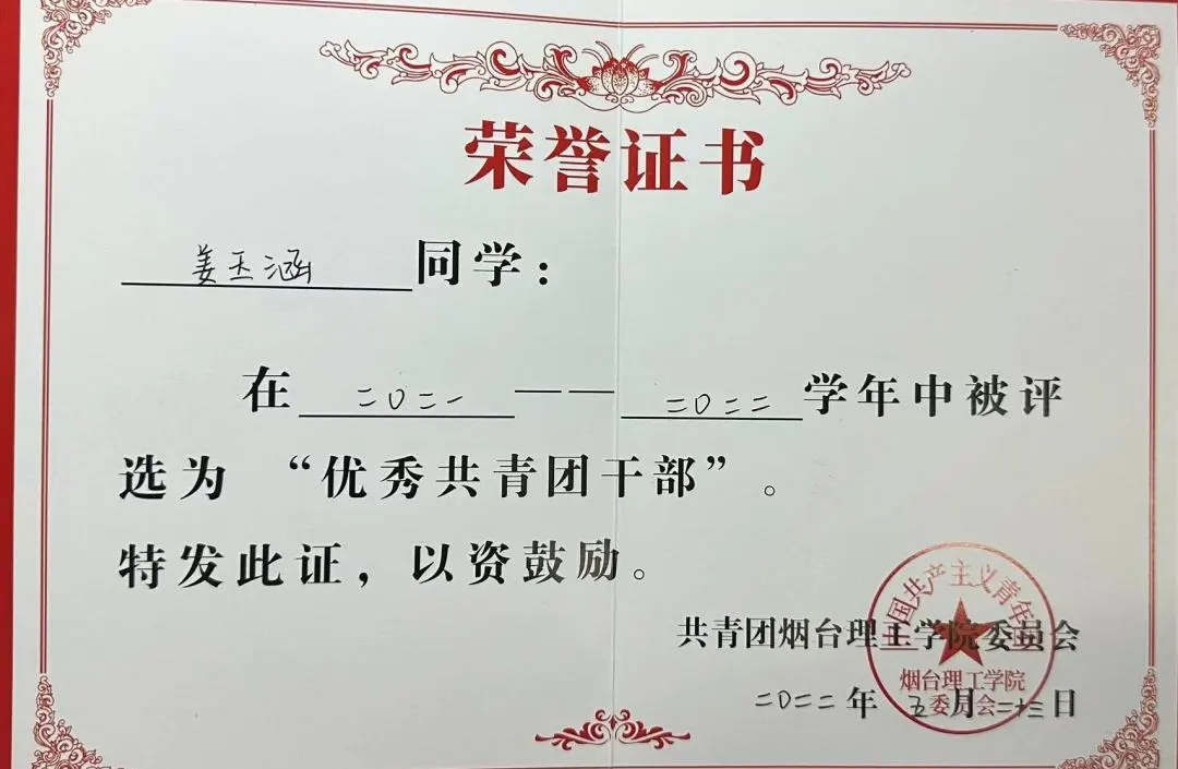 所获荣誉:优秀共青团干部,优秀实习生二等奖,挑战杯校级优秀奖,校级优秀毕业生,2021年优良班助,暑期社会实践校级二等奖。