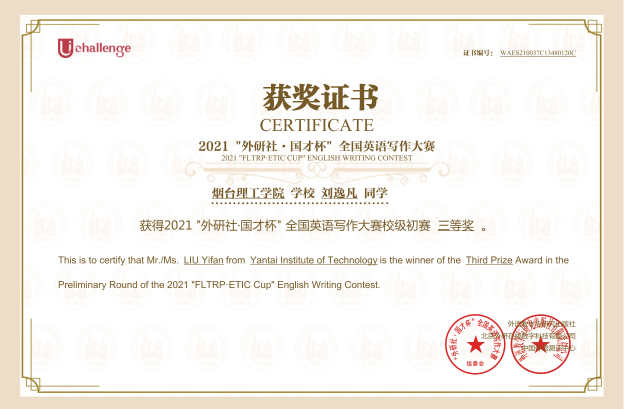 2.2021学年度"外研社•国才杯”全国英语写作大赛校级三等奖;