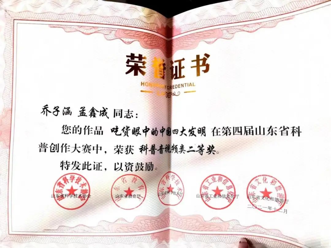 3.2021年山东省科普创作大赛二等奖;