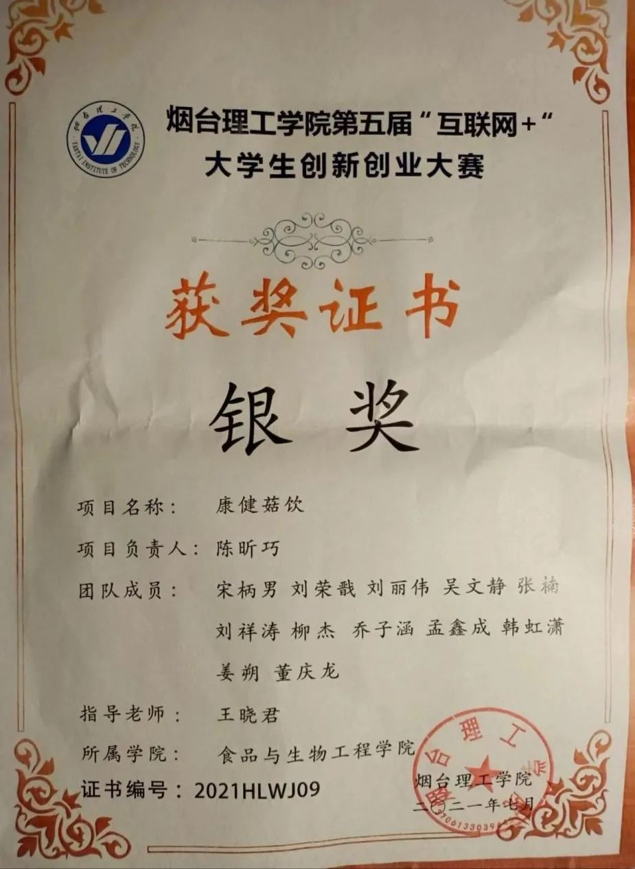 2.2021年第十三届山东省老员工科技节食品加工与安全创新设计大赛二等奖;