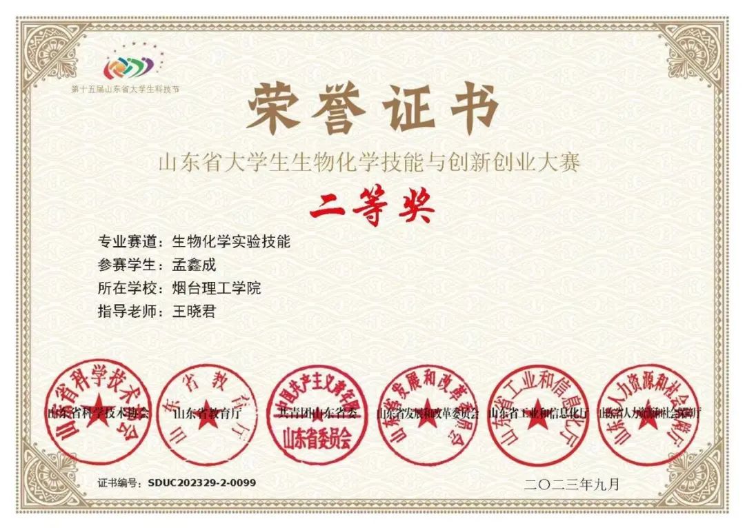 6.2023年山东省生物化学技能大赛二等奖;
