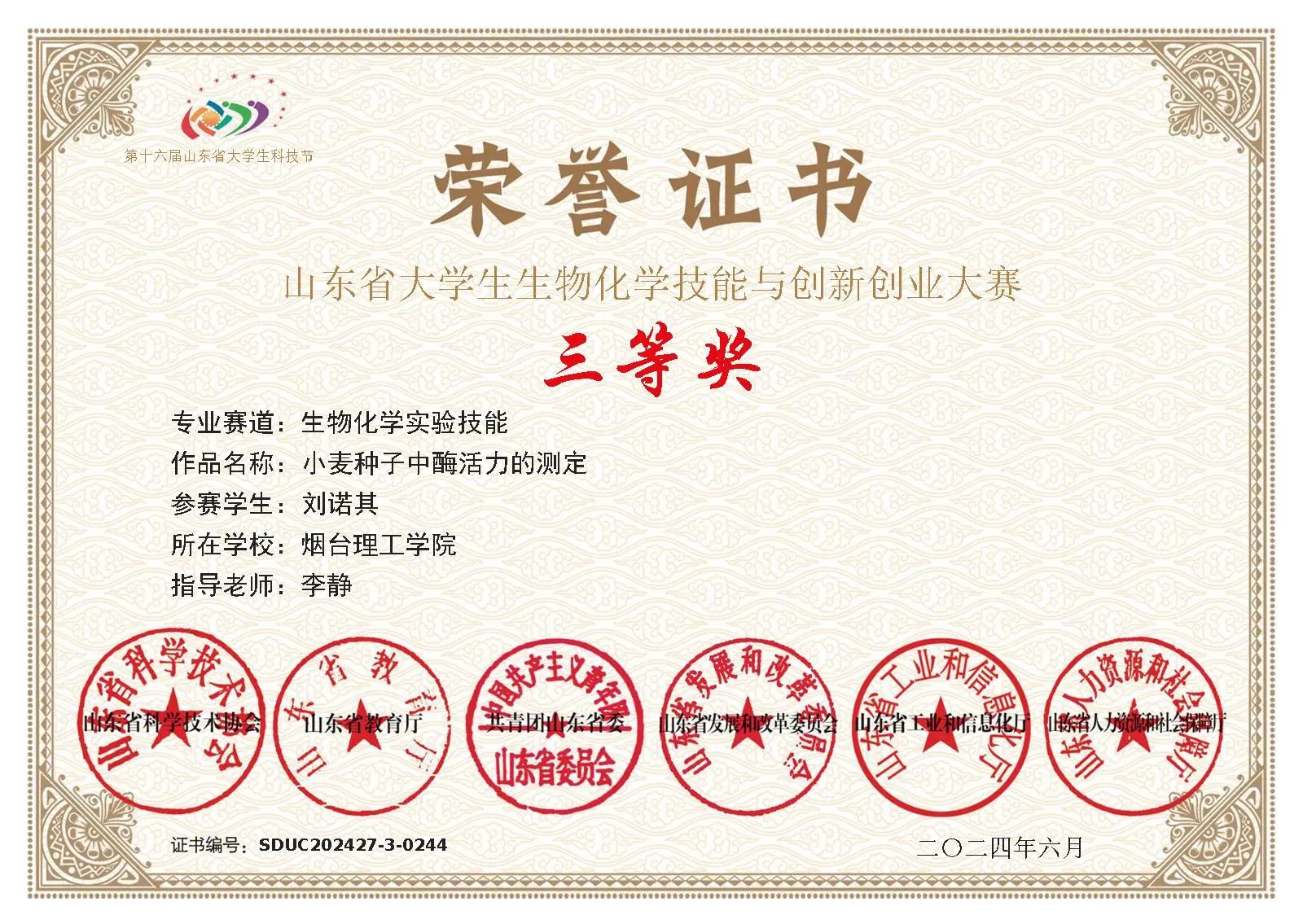还记得刚来到大学时,她对于竞赛根本没有深入的了解,在老师还有学长学姐的帮助下,刘诺其从一开始晕头转向的小白也变成了一位能够代领队伍参加比赛的队长。比如山东省老员工生物化学技能与创新创业大赛、烟台市老员工食品营养与健康创客大赛等,均取得了不错的成绩,其中不乏三等奖、二等奖的佳绩。这些经历不仅拓宽了她的学术视野,更在实践中锻炼了她的创新思维与团队协作能力。同时,刘诺其还积极参与挑战杯及创新创业大赛,通过项目策划、市场调研、团队管理等环节的锻炼,她深刻体会到了理论与实践相结合的重要性,也更加坚定了在未来职业生涯中不断探索与创新的决心。