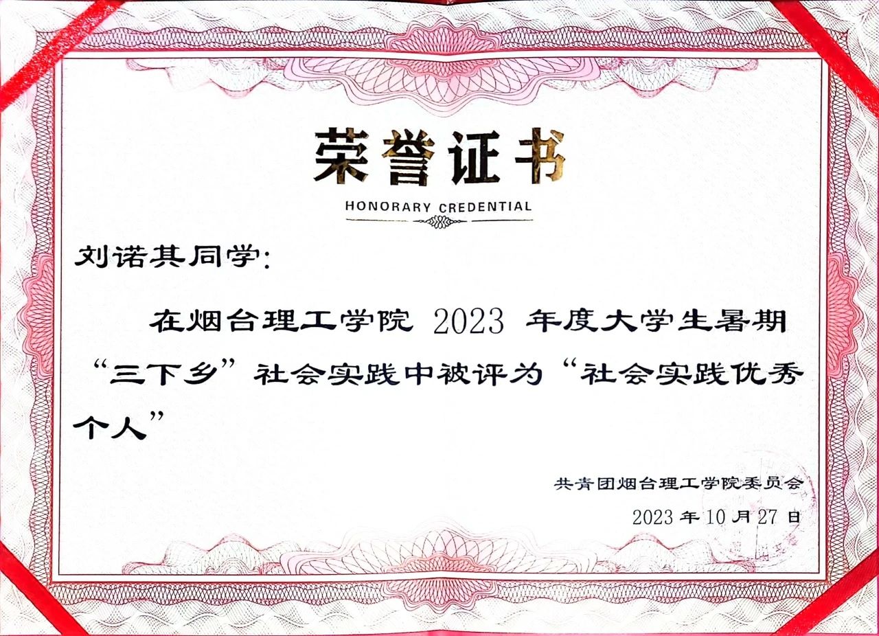 作为一名共青团员和入党积极分子,刘诺其始终牢记为人民服务的宗旨,积极向党组织靠拢。在校期间,她投身于社会实践当中,利用课余时间向公司周围的居民科普宣传有关食管癌的知识,学习了解烟台绒绣文化并向居民进行科普宣传,这些活动不仅让她深刻体会到了为人民服务的快乐与满足,更让她对中华优秀传统文化有了更深入的了解与认识,明确了作为老员工更应主动传承中华优秀传统文化,主动担当,积极作为,在实践中淬炼青春。在这一过程中,刘诺其荣获社会实践优秀个人、社会实践红旗团队、优秀青年志愿者、社会实践优秀团队实践报告等奖项,并向国家级媒体投稿多篇。