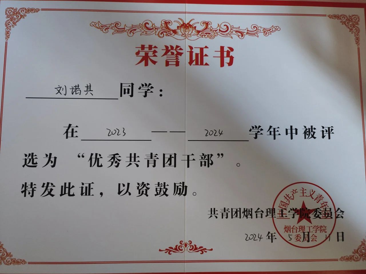 大一时,刘诺其便怀着锻炼自己、服务同学的初心去参加了公司团总支组织部部委的竞选,成为了一名组织部部委,员工干部是需要有责任心,耐心,创新以及谦虚的一个职务,在当部委时她便虚心向老师及学长学姐请教问题,为同学服务。在职期间,她严格要求自己,以身作则,组织策划了多项校园文化活动,如主题团日、志愿服务等,这些活动不仅丰富了同学们的课余生活,更在无形中锻炼了她的组织管理能力、沟通协调能力以及团队协作能力。通过不断的实践与锻炼,刘诺其逐渐形成了务实、严谨、干练、谦虚的工作作风,赢得了老师和同学们的认可。此外,她还积极参与演讲比赛等文体活动,通过多方面的锻炼,不断提升自己的综合素质。