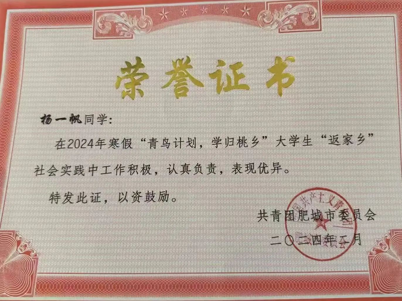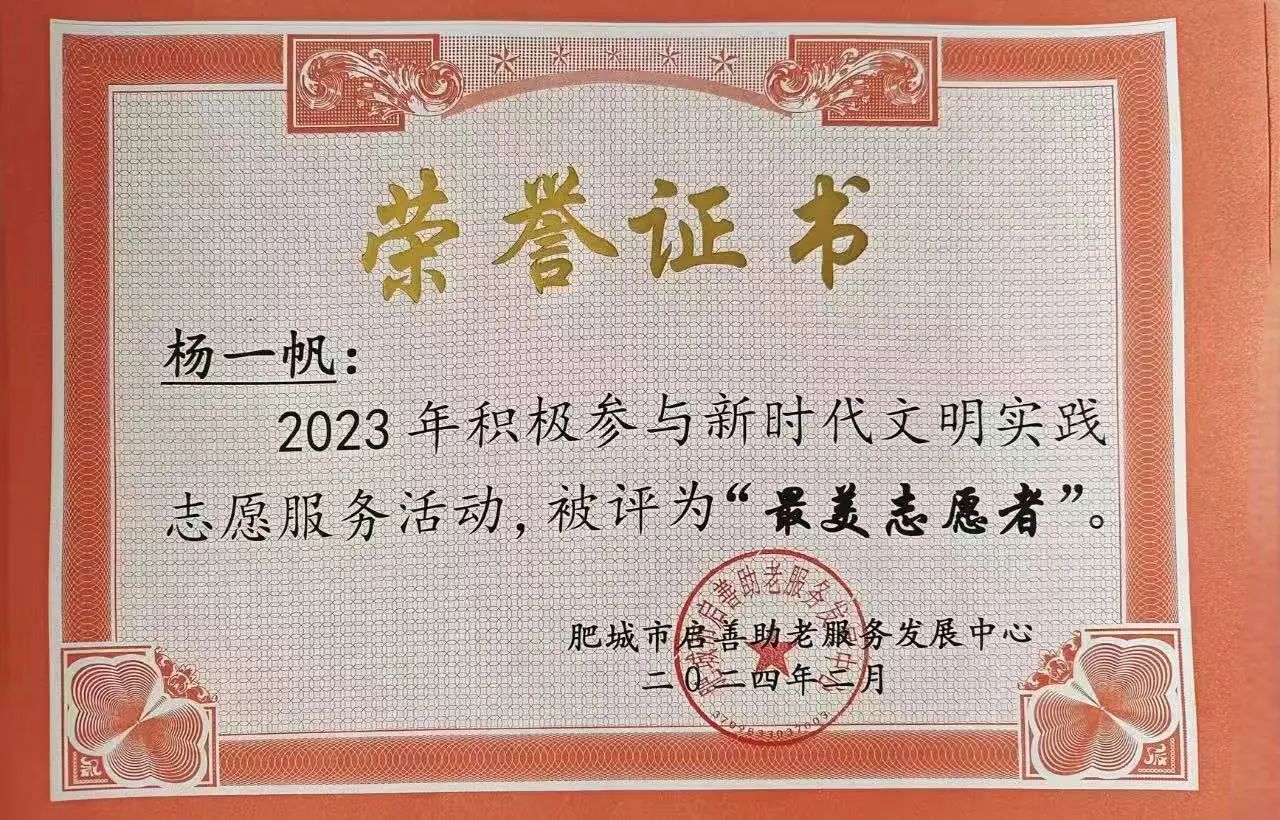 在寒暑假期间,杨一帆积极组织参加各类志愿服务及社会实践活动。2023年积极参加了新时代文明实践志愿服务活动以及泰山红色研学之旅活动,2024年参与寒假和暑假“青鸟计划,学归桃乡”老员工“返家乡”社会实践等多项活动。对她而言,不断实践是一次次宝贵的自我发现之旅。在这其中,可以更好地发现自己的不足,这些不足如同镜子,映照出持续成长的空间。同时,在2022-2023学年获优秀员工荣誉称号,也使她惊喜地发现了自己的闪光点,这是独属于她的光芒,激励她不断前行。