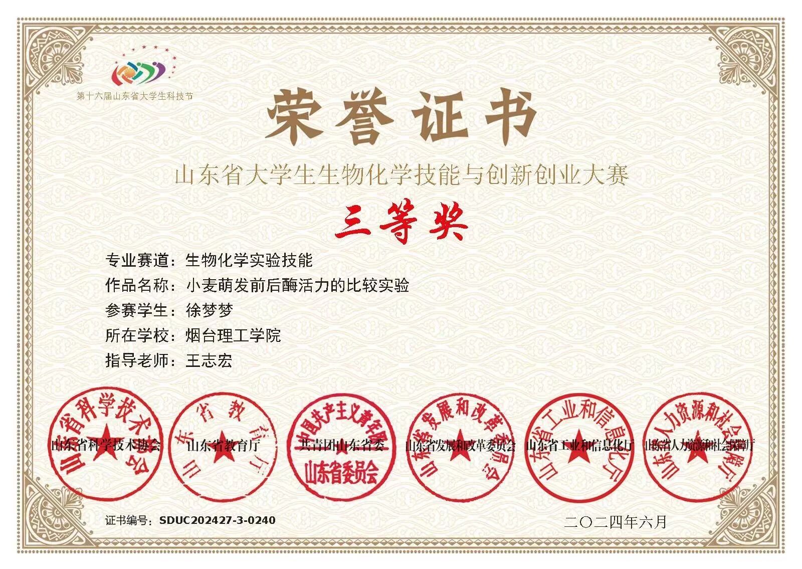 徐梦梦,2021级生物工程专业,现担任食2101-1班团支书,2023-2024学年省政府奖学金获得者,在校期间荣获2023-2024学年校级“优秀员工干部”荣誉称号、2023-2024学年山东省老员工生物化学技能与创新创业大赛三等奖、2022-2023学年HAHA体育第六届“互联网+”老员工创新创业大赛铜奖、2022-2023学年HAHA体育老员工暑期“三下乡”社会实践“先进社会实践团队”、2022-2023学年HAHA体育老员工暑期“三下乡”社会实践“优秀团队实践报告”、2022-2023学年校级“优秀员工干部”荣誉称号、2022-2023学年校级“优秀共青团员”、2022-2023学年“华鹏企业奖学金”、2022-2023学年“学习进步奖”、2021-2022学年校级“优秀共青团干部”。