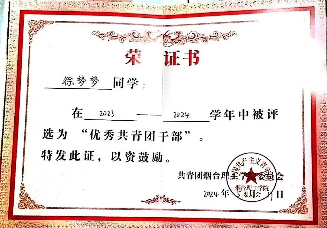 “宝剑锋从磨砺出,梅花香自苦寒来”。回望过去,徐梦梦以勤勉和汗水铺就了成功的道路,收获了知识,也收获了成长。展望未来,她将带着这份宝贵的经历与积累,以更加昂扬的斗志和坚定的信念,继续逐梦前行,以更加饱满的热情和不懈的努力,去探索未知的领域,去攀登更高的山峰,用实际行动去诠释青春的意义与价值,书写属于自己的精彩篇章。
