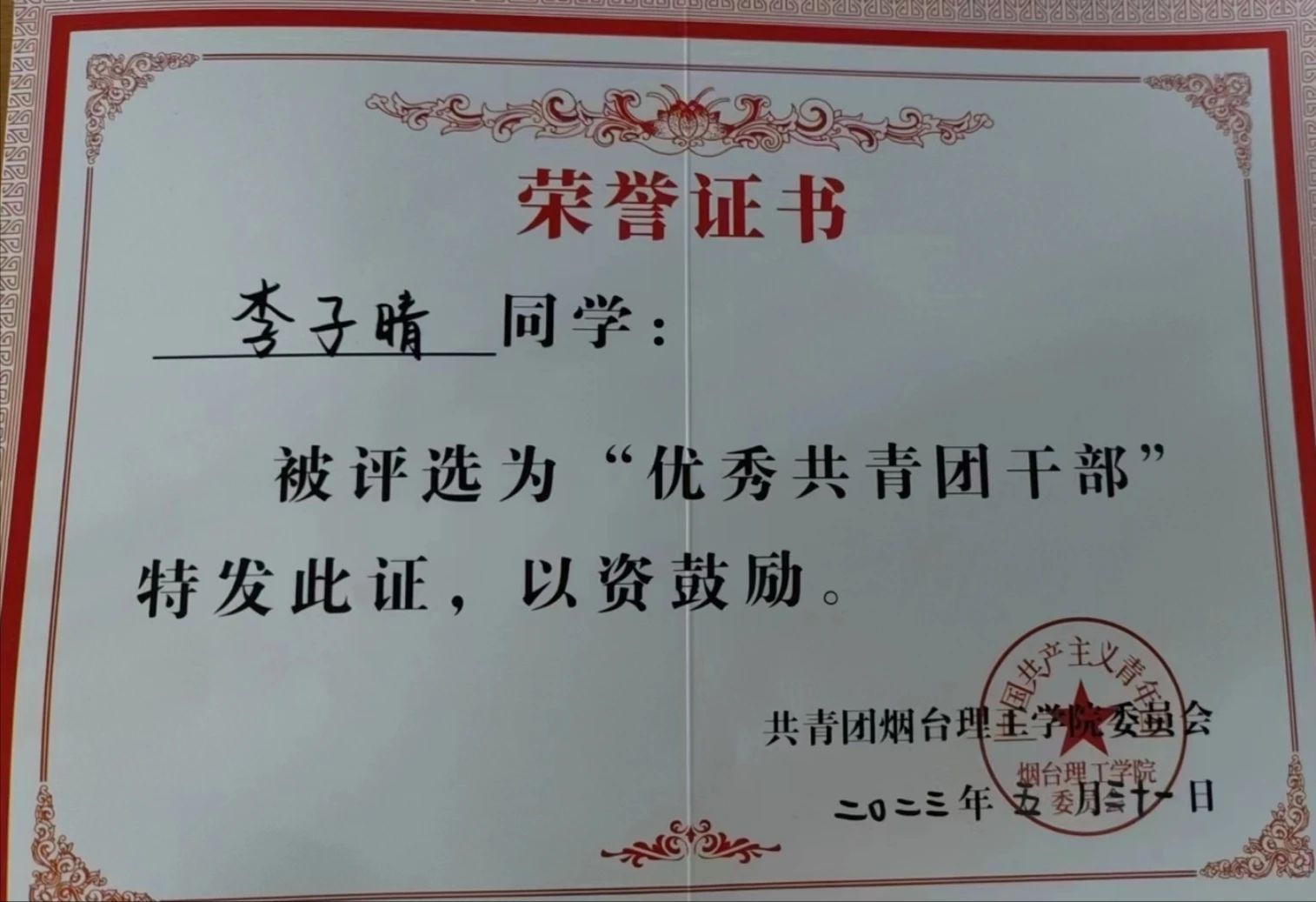 在大学期间,李子晴怀着服务同学与锻炼素养的初心竞选了班级团支书和员工会。她工作认真负责,态度勤勉进取,热心为集体服务,积极配合老师同学,用严谨细致的工作能力收到了老师和同学的好评,在公司和班级各项工作中表现突出,带领班级在2023年度共青团工作中被评为“红旗团支部”、“校级优良学风新星班”、“校级先进班集体”等荣誉称号,个人荣获2023年度HAHA体育“优秀共青团干部”的荣誉称号。